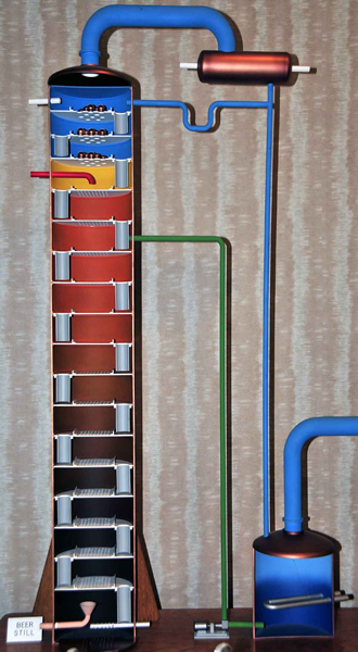 A model of a distiller sits on a table along with one of the Mash Tub. Each one is colored coded so the production flow can be followed. From mash to alcohol. It is by far the best visual explanation we have seen.