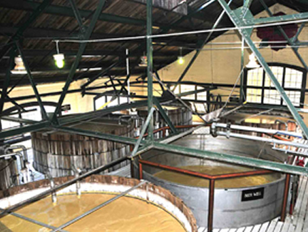 Then up to the second floor of the distillery building to where the ground grains, water and yeast are brought together and heated. Four Roses uses cypress barrels, some very BIG barrels. How about 16,400 gallons barrels. Twenty three 16,400 gallon barrels. Do the math, 377,200 gallons of booze in the makings.