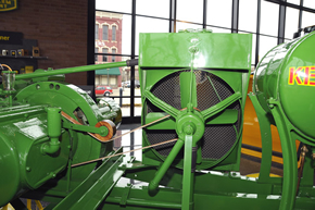 cool. It was the 12 horsepower 1920 Waterloo Boy that ran on kerosene. In 1918 Deere bought the Waterloo Gas Engine Company and continued to produce the Waterloo Boy tractors until 1924. The cooling fan is driven by a leather belt. To make her move the main wheels are driven by gears inside the rims.