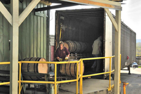 A truckload of new barrels were being rolled off and readied for filling. The filling station had barrels waiting to be filled but the fillers were not to be seen so we offered to help.